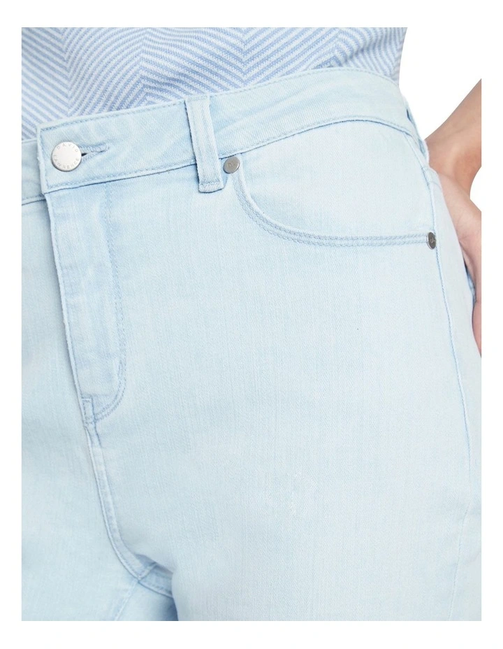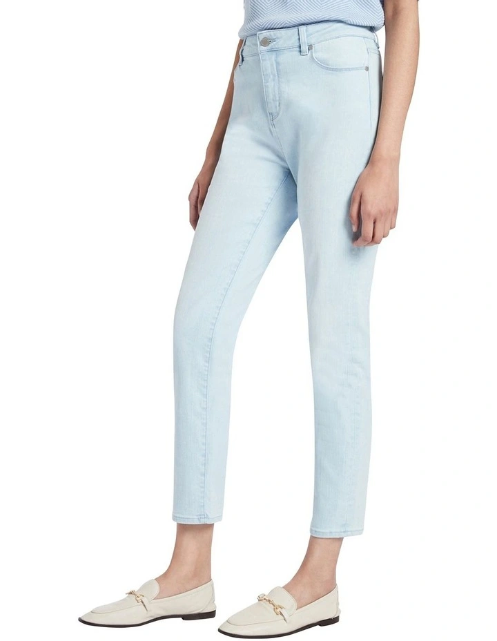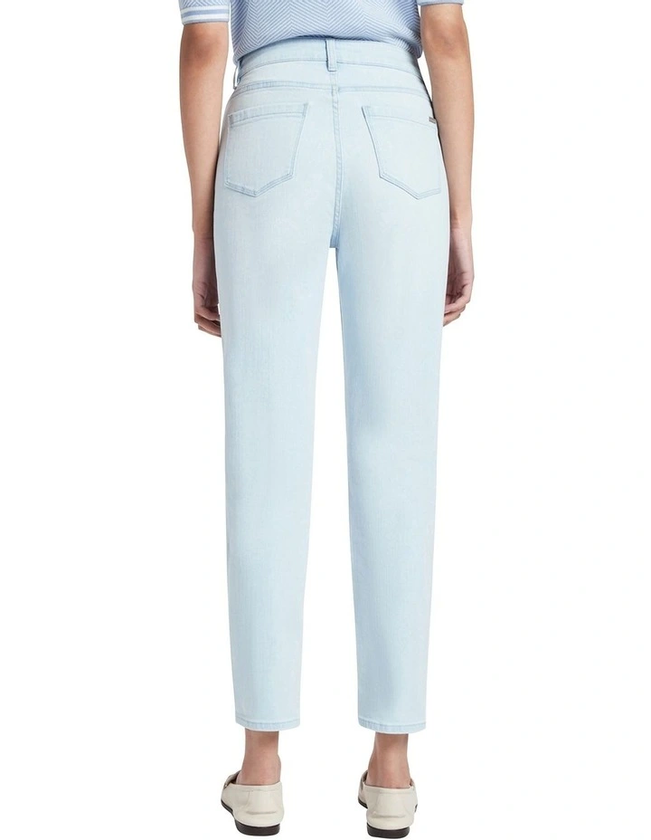 Showing off a gorgeous pale wash, these jeans reveal essential mom fit shaping, descending from a mid rise waist through a relaxed fit to ankle length. Made from Australian cotton-blend denim with stretch for movement, the jeans are completed by a button and concealed fly front closure, belt loops at the waist, and five pocket jean styling.