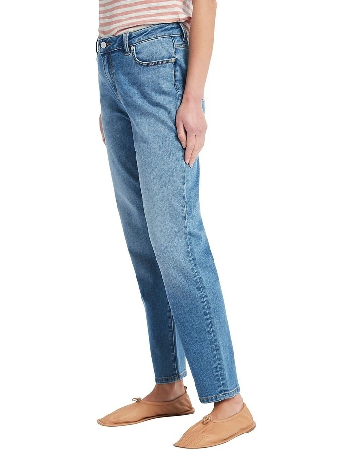 Effortless and easy-wearing, these light wash mom jeans descend through a high rise, relaxed fit to a full length leg. Made from Australian cotton stretch denim treated with an Eco Wash, the jeans remain ever-comfortable, showing off detail in their classic button and fly front closure, five pocket jean styling, belt loops at the waist, and David Lawrence branded hardware.