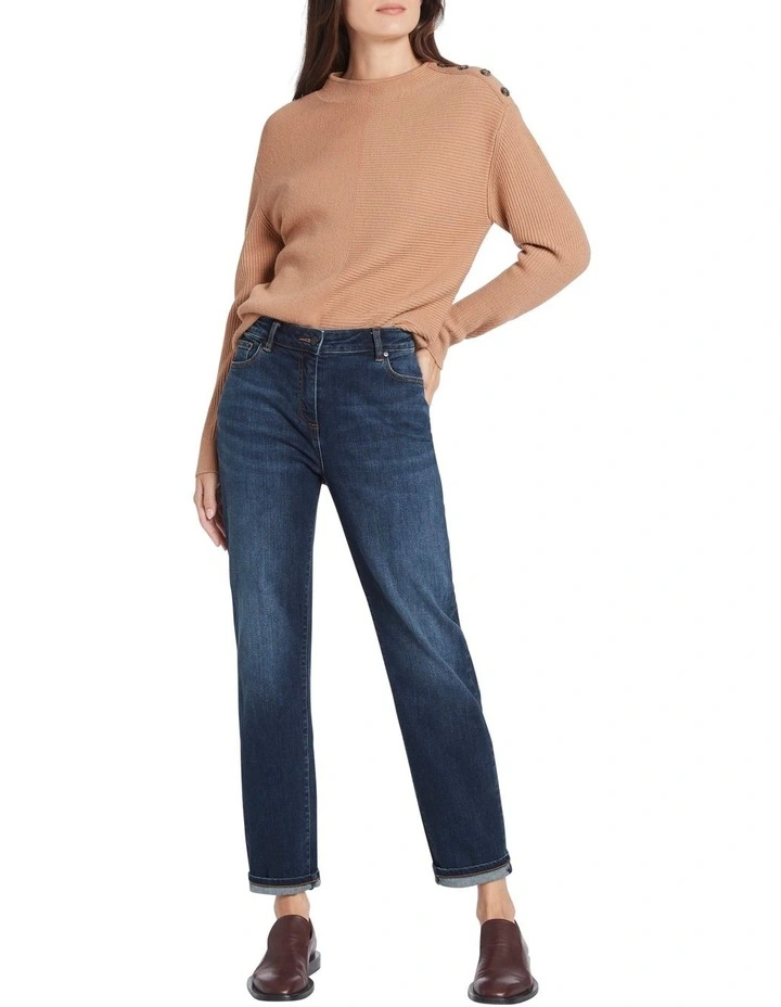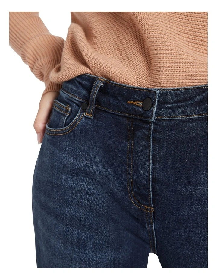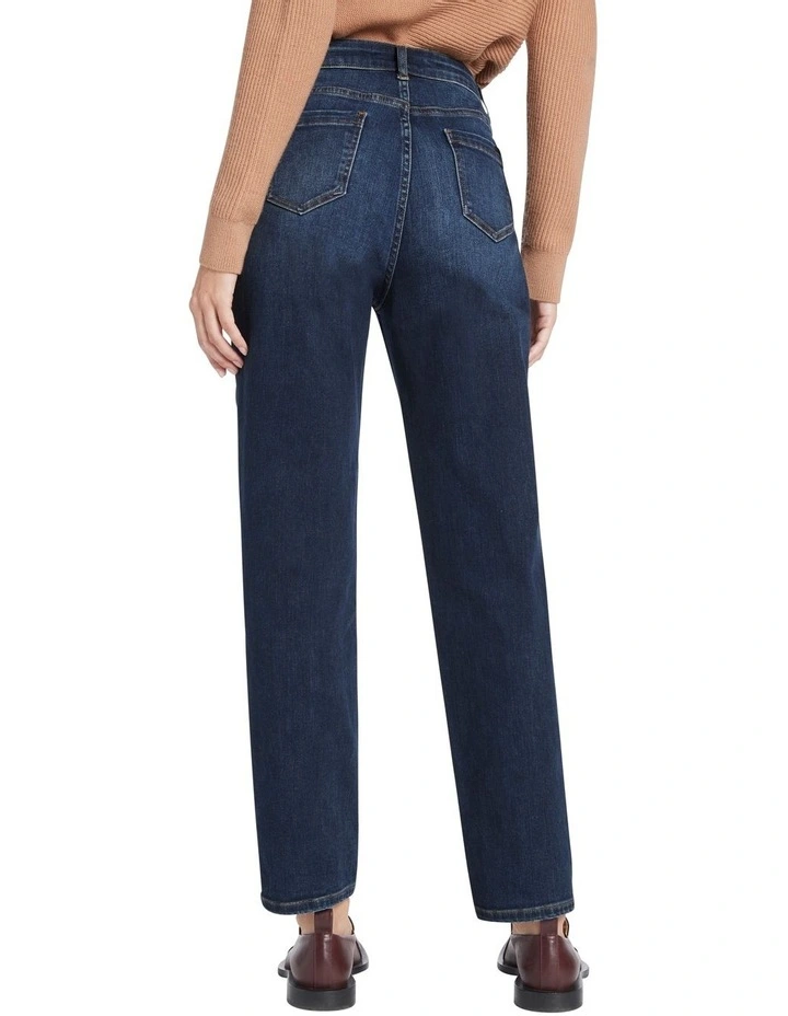 Flaunting one of this seasons essential silhouettes, these mom jeans curve over the hips from a high rise waist, to descend through a relaxed fit leg to full length. Made from Eco Wash Australian cotton stretch denim in an effortless dark rinse, the jeans are completed by a button and concealed fly front closure, five pocket jean styling, and contrast topstitch detailing throughout.
