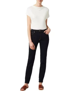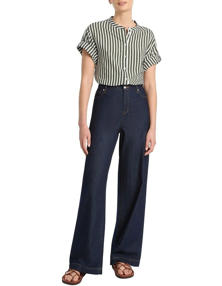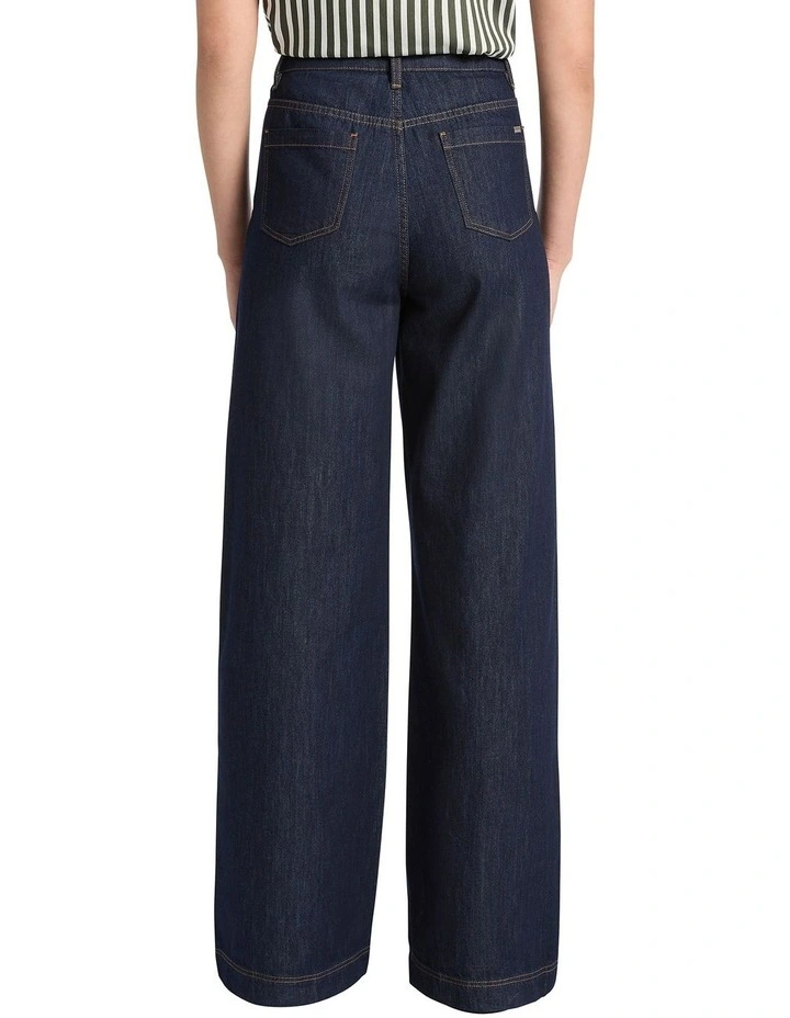 Moving easily within an effortless, stretch style, these wide leg jeans deliver essential styling, enhanced by a flattering high rise and gorgeous dark indigo colouring. Accentuated by contrast topstitching throughout, the jeans flow through Eco Wash Australian cotton denim, further complemented by front and back pocketing and a classic button-and-fly front closure.