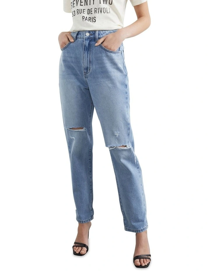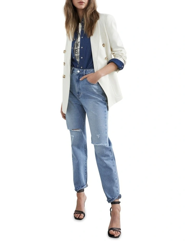 Step out in style in our Distressed Straight Leg Jean. This jean offers a great straight leg fit and features open abraision detailing at the knee, a rolled cuff, branded leather patch and branded shanks. Pair with our Double Breasted Twill Blazer and Carrie Leather Heel.