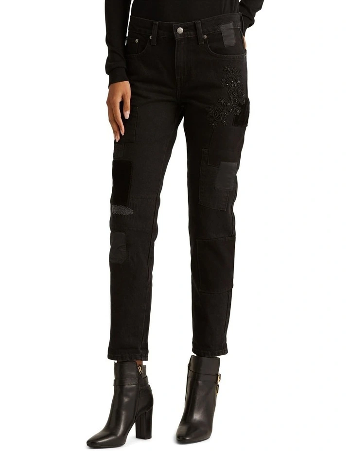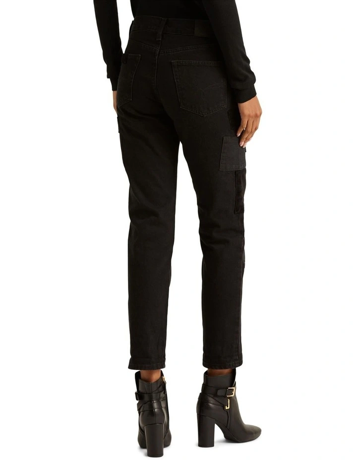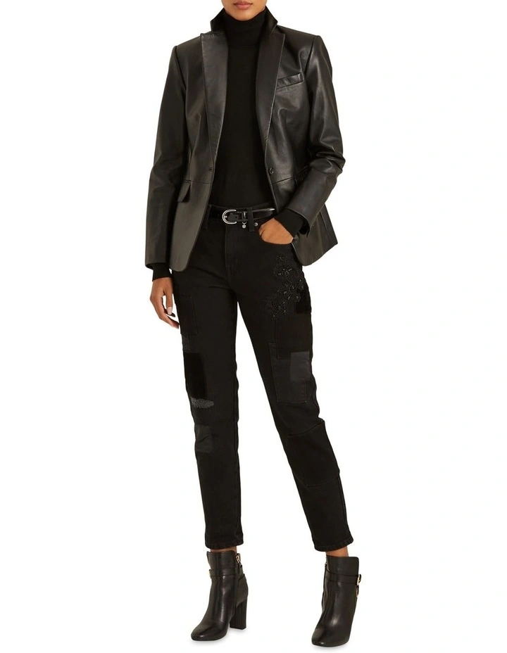 - Five-pocket styling with signature metal rivets. Debossed signature leather patch at the back right waist.
