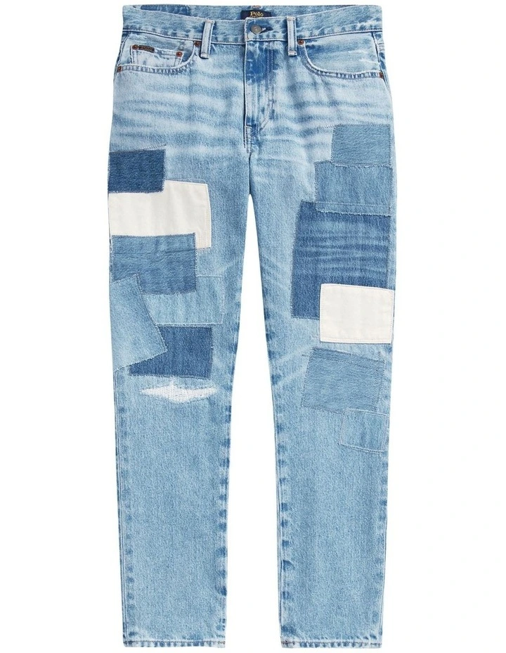 - Five-pocket styling with signature “P.R.L. 67”-engraved metal rivets. “Polo” patch at the coin pocket.